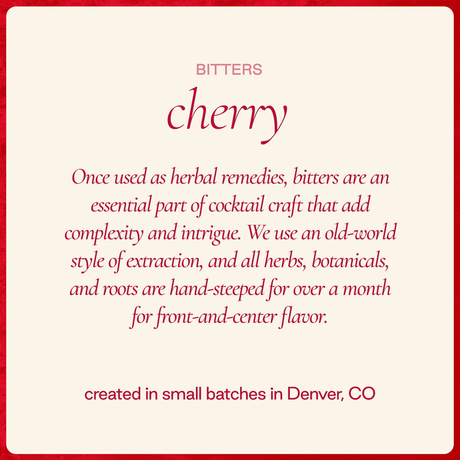 Jaded by the extracted flavor of most cherry bitters on the market, we set out to make a version that really tastes like fresh peak-summer cherries, ideal for enhancing classics like the Manhattan and adding a rich, fruity note to cocktails and mocktails made from brown and white spirits alike. Our Cherry is built on real organic tart/bing cherries, which give this bitters a voluptuous, fruit-forward profile.