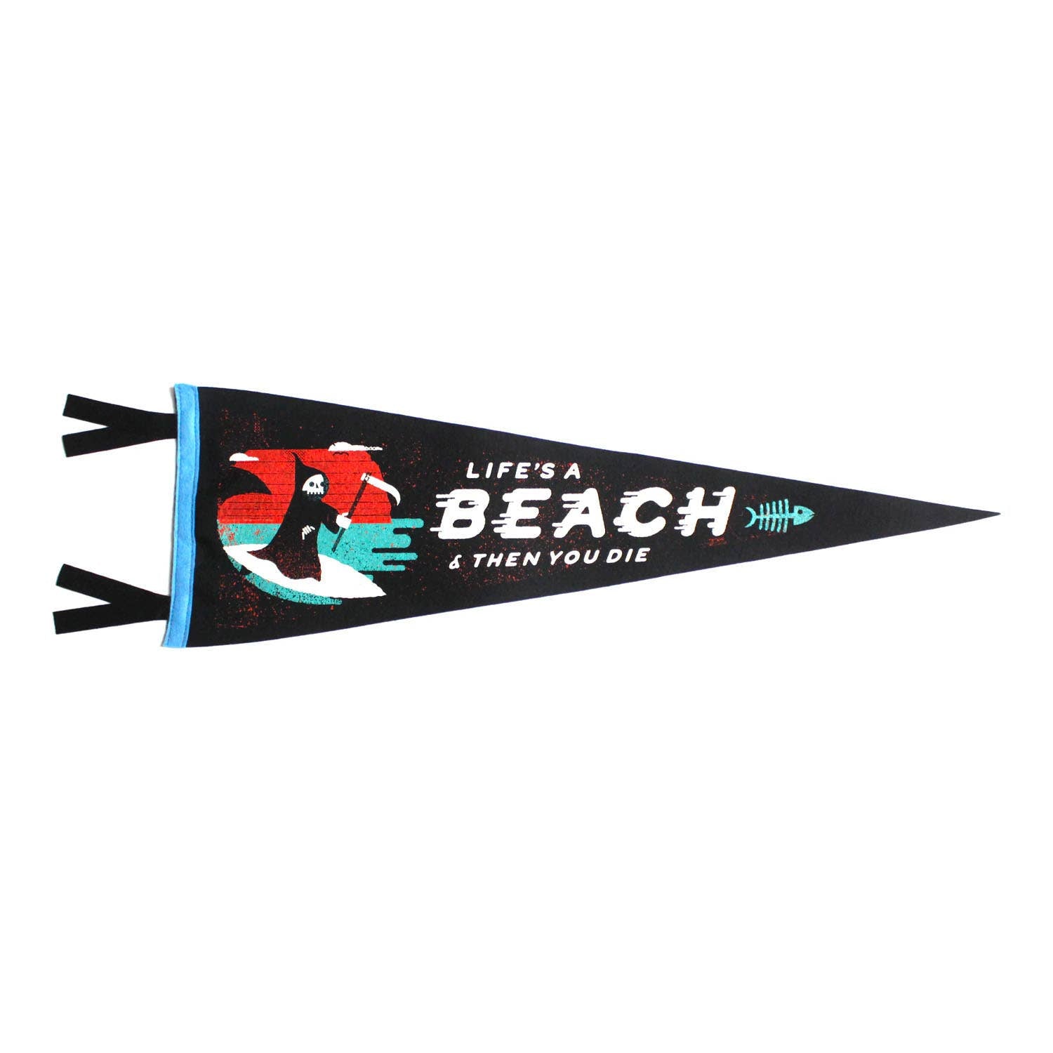Life's a beach, then you die. This custom pennant features original lettering and surfing grim reaper illustrations from Charlie Wagers. Ride the wave.